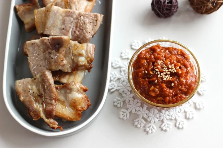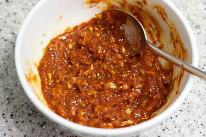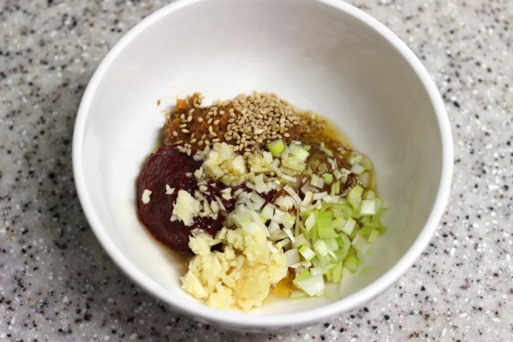 [재료]: 된장 2큰술, 고추장 1큰술, 참기름 1큰술,