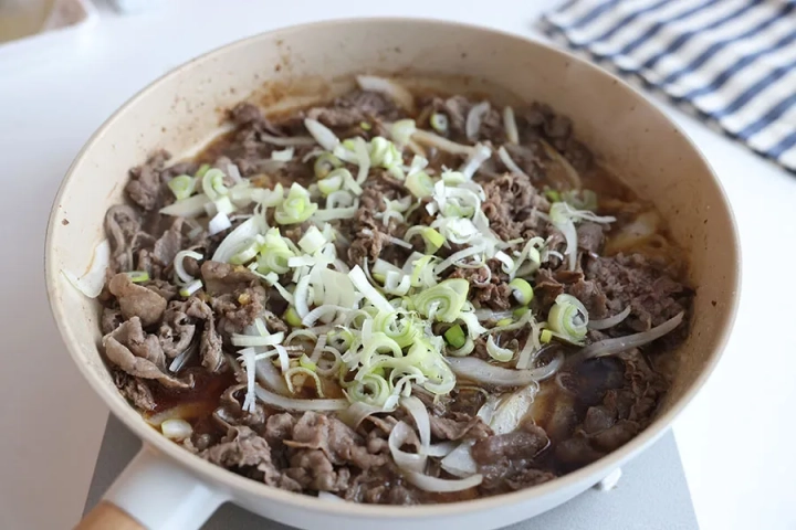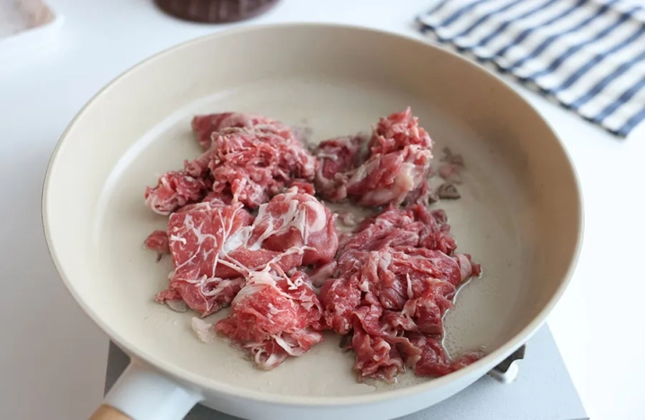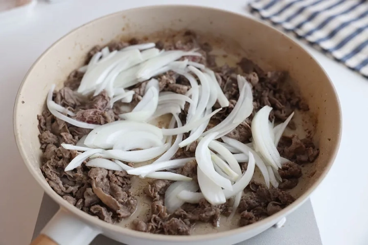 먼저 규동소스를 끓이다가 고기를 볶아줘도 돼요.