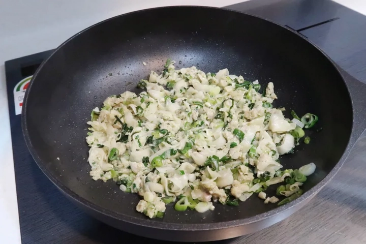 파기름향이 올라오면 잘게 썬 만두를 넣어 볶아주세요.