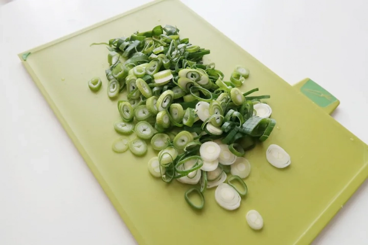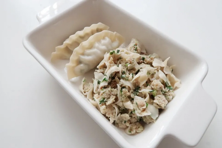 냉동만두는 전자레인지에 해동한 뒤 잘게 잘라주세요.