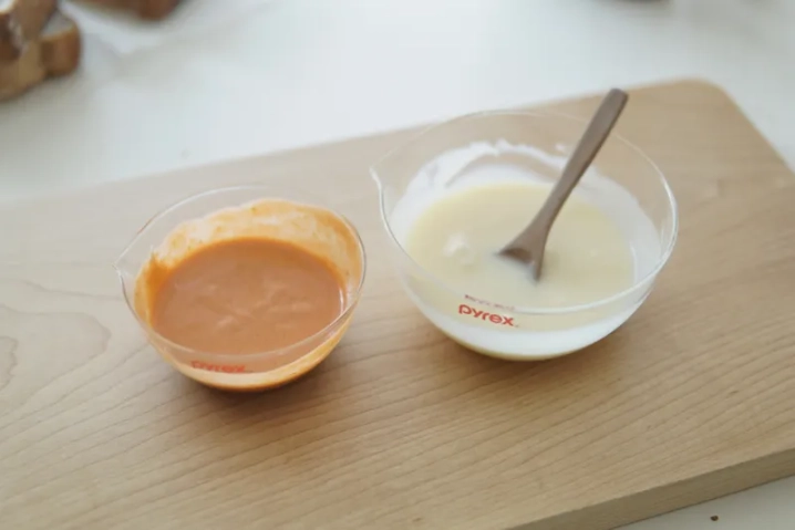 식빵 안쪽에 두가지 소스를 넉넉하게 발라주세요.