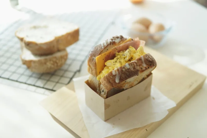 식빵 사이에 치즈와 햄, 스크램블에그를 듬뿍 넣어주고