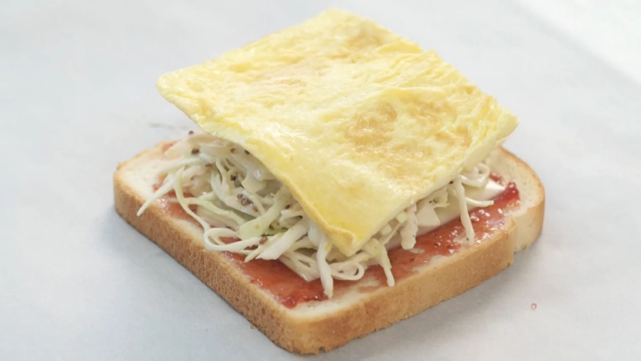 [재료]: 양배추 2장, 식빵 2장, 치즈 1장, 달걀 2개, 딸기잼