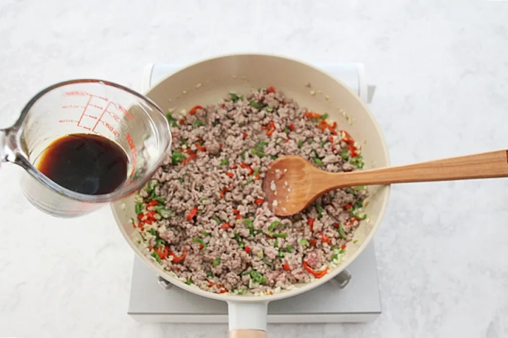 돼지고기가 골고루 익으면 양념장을 부어 기름에 눌리듯 볶아주세요.