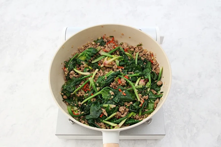 [재료]: 시금치 200g, 다진돼지고기 350g, 마늘 5개,