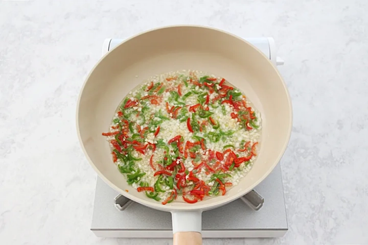 다진 마늘과 고추를 넣어 골고루 볶아주세요.