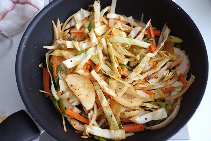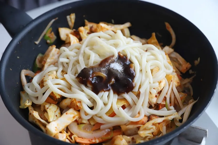 채소가 어느 정도 볶아지면 우동면을 넣고