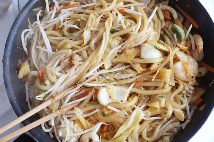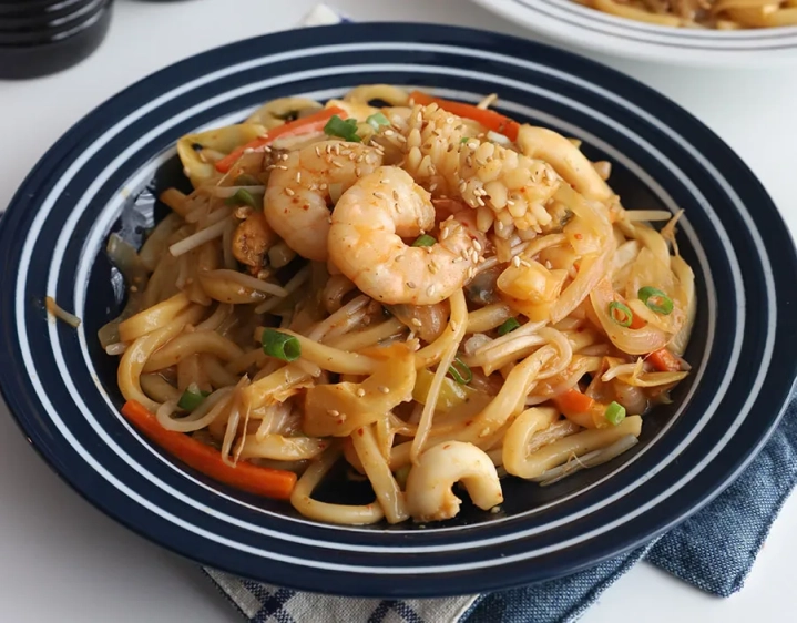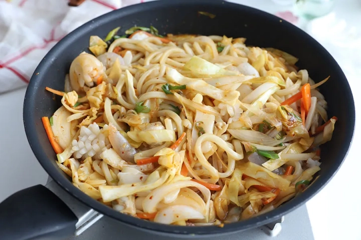 [재료]: 우동사리 200g, 해물믹스, 양배추 100g,