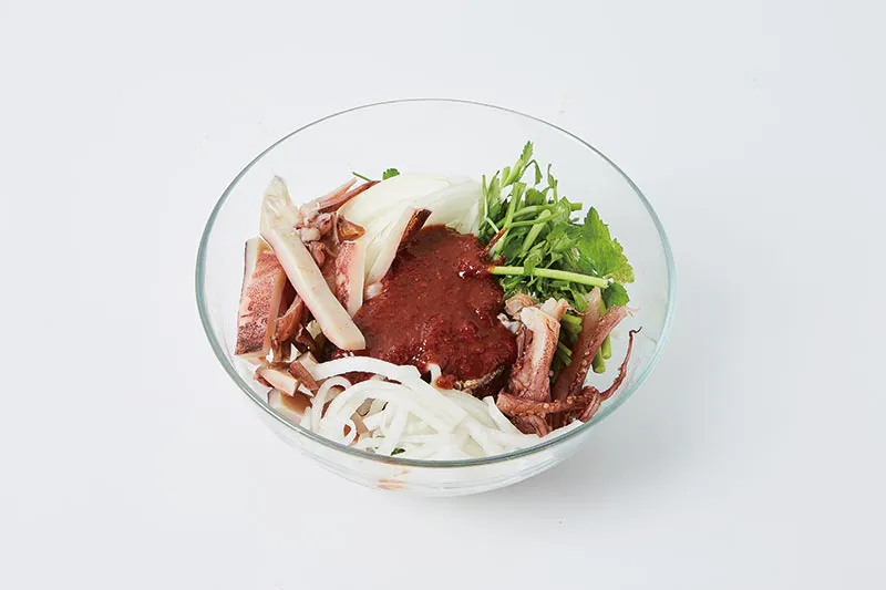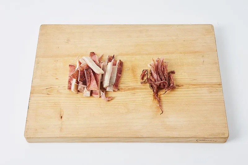 마른 오징어를 10분 정도 데쳐 사용해도 좋아요.