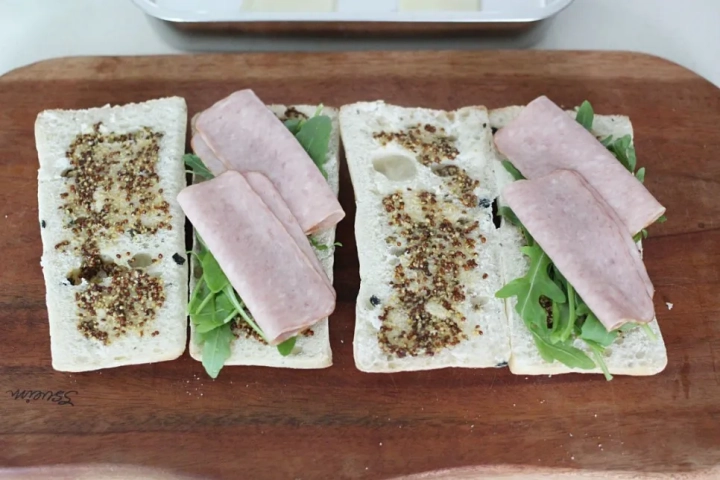 [재료]: 치아바타빵 2개, 슬라이스햄, 루꼴라,