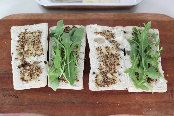 그 위에 물기 제거한 루꼴라를 얹어주세요.