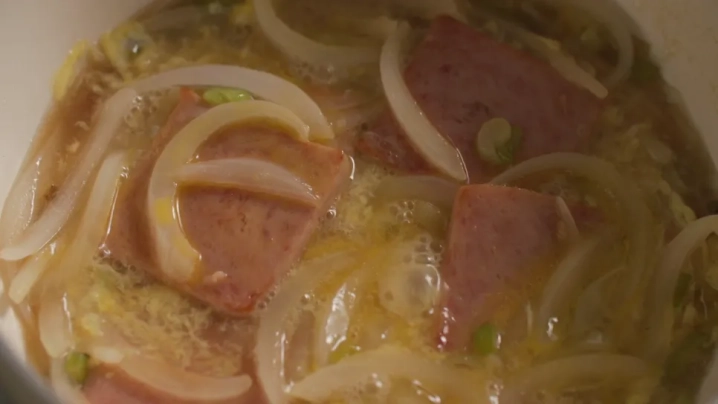 [재료]: 스팸 120g, 대파 1/2대, 달걀 2개, 양파 1/2개