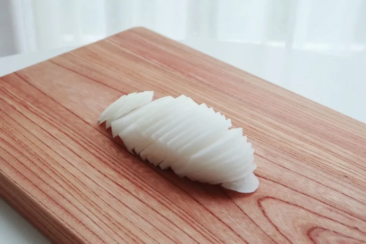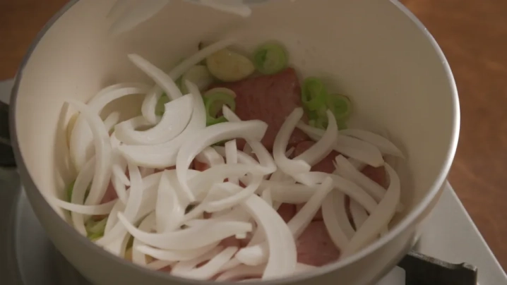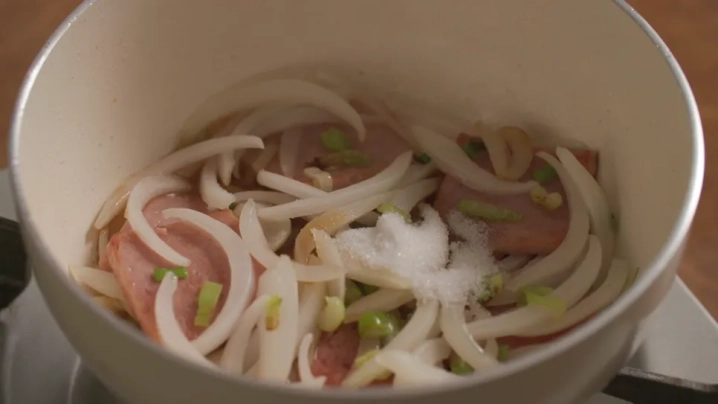 스팸이 노릇하게 구워지면 양파를 더해 볶아주세요.