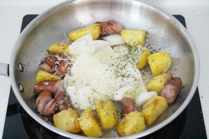 [재료]: 소시지 2개, 감자 2개, 양파 1/2개, 버터, 치즈가루