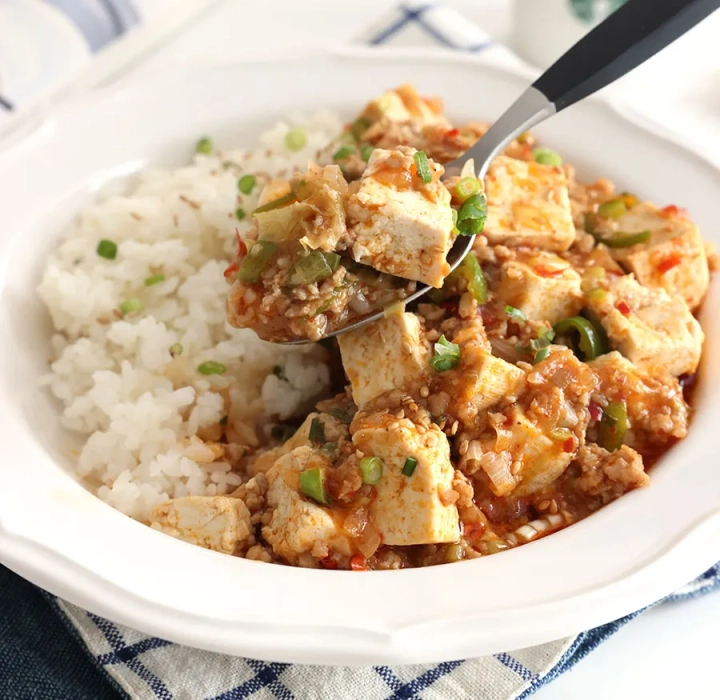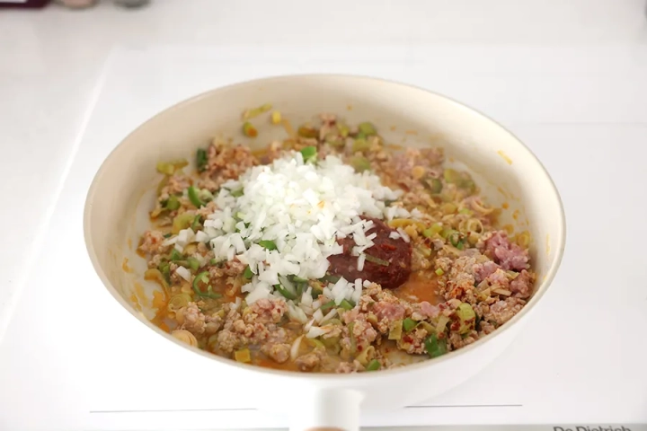 [재료]: 두부 300g, 다진 돼지고기 200g, 양파 1/2개,