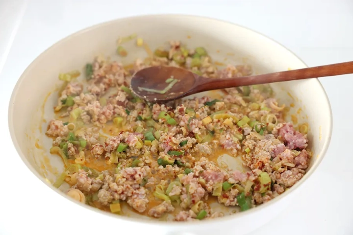 돼지고기 다짐육, 후추, 다진마늘, 다진생강을 넣고 볶아주세요.