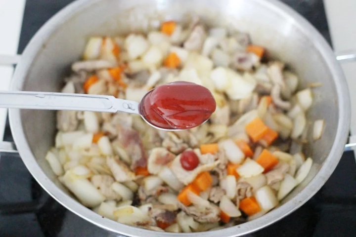간장이 고루 섞이면 케찹을 더해 골고루 볶아주면서