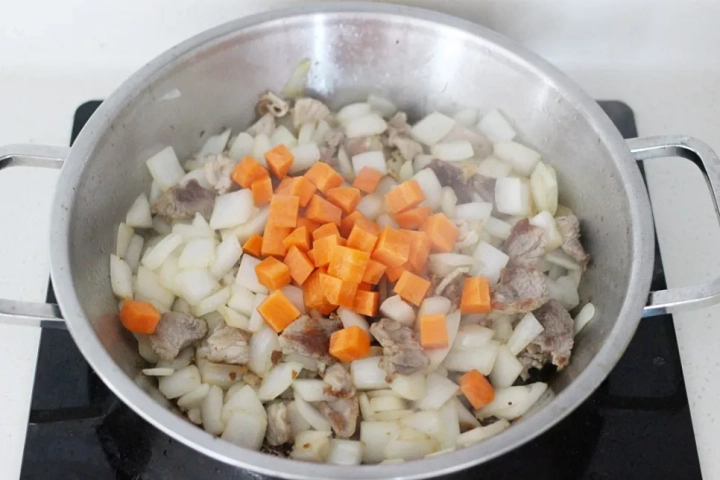 양파가 노릇하게 변하면 당근을 넣어 볶아주세요.