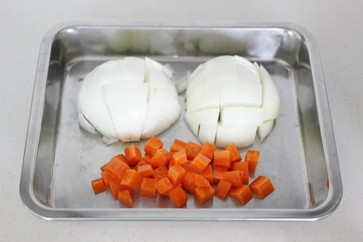 양파와 당근은 깍뚝 모양으로 썰어주세요.