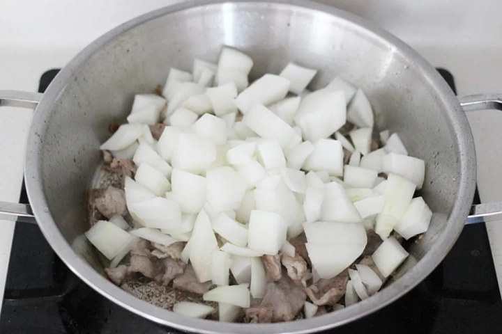 고기가 충분히 익으면 양파를 넣고 달달 볶아주세요.