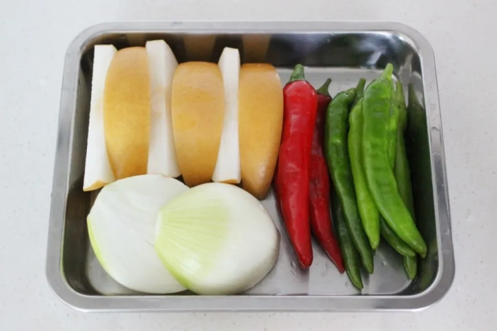배는 적당한 크기로 썰고 양파는 반으로 잘라주고