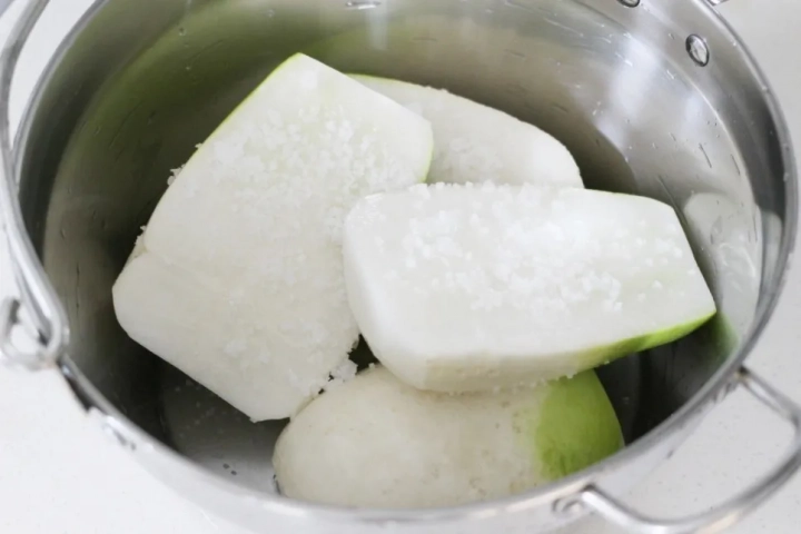 천일염 1/2종이컵을 무에 고루 얹어주고