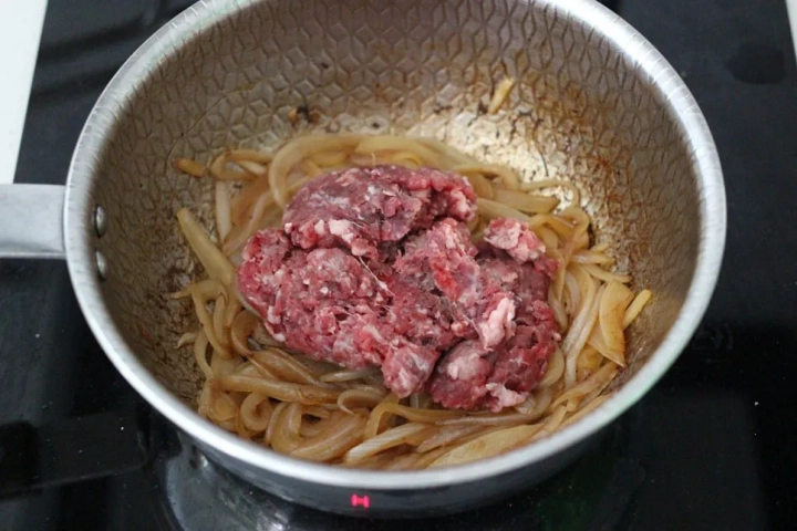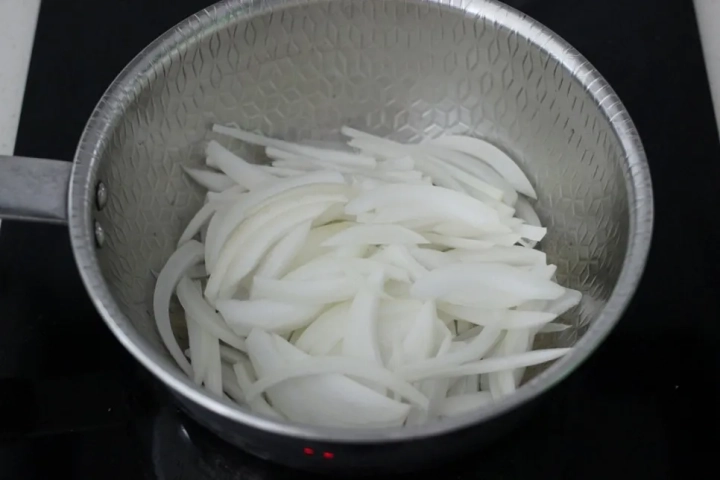 달군 팬에 기름을 두르고 채썬 양파를 볶아주세요.