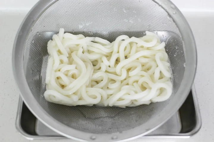 우동면은 뜨거운 물에 살짝 데쳐 물기를 제거해주세요.