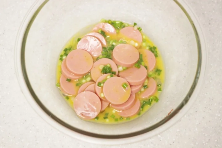 [재료]: 분홍소시지 1/2개, 달걀 2개, 쪽파, 소금, 후추