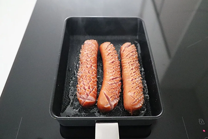 물기 제거한 소시지는 노릇하게 구워주세요.