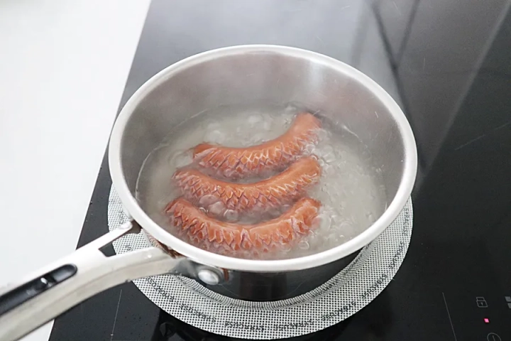 소시지는 칼집을 넣어 끓는 물에 살짝 데쳐주고