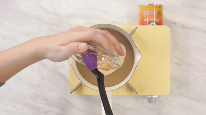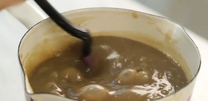 갈아놓은 밤에 황설탕, 꿀, 물을 넣고 계속 끓여주세요.