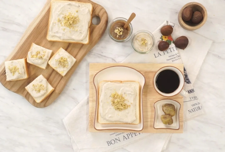 [재료]: 생크림 100g, 밤 100g, 꿀 2큰술, 설탕 2큰술, 황설탕 30g, 식빵