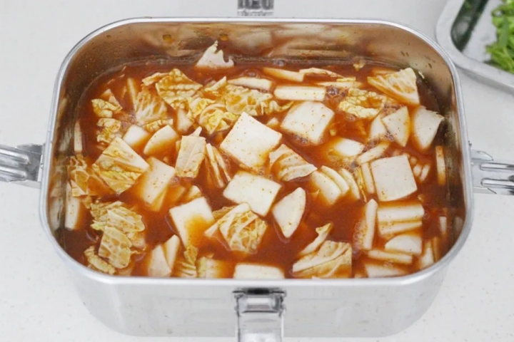 양념국물을 절여둔 배추와 무에 부어주세요.