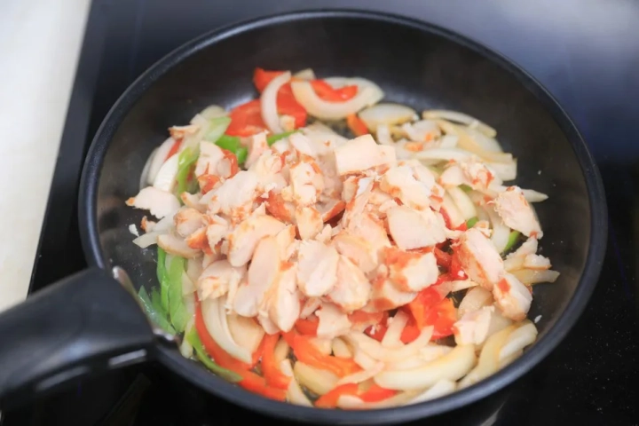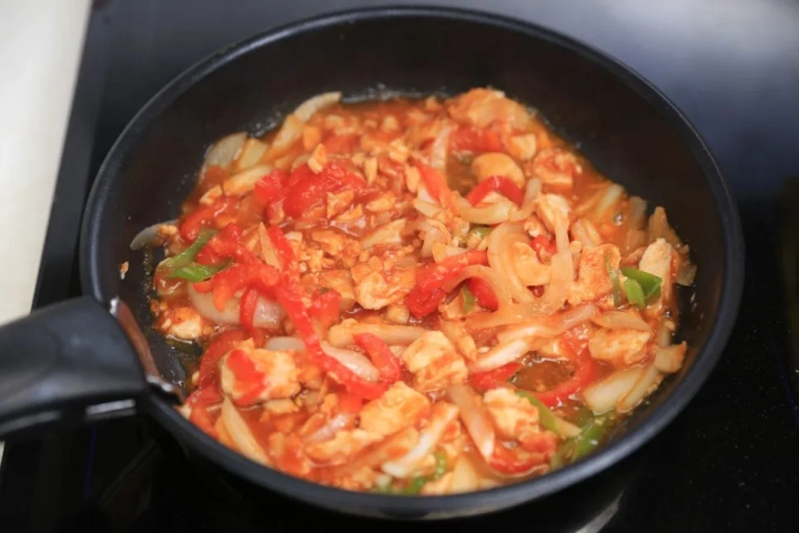 야채들이 충분히 익으면 닭고기를 더해 볶아주세요.