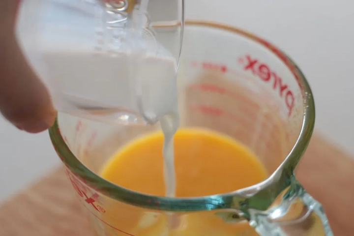 곱게 내린 계란물에 우유를 더해 골고루 섞어주세요.