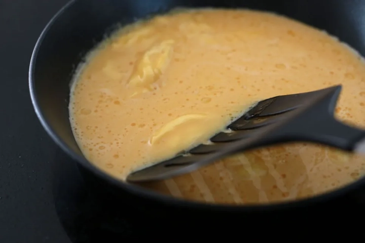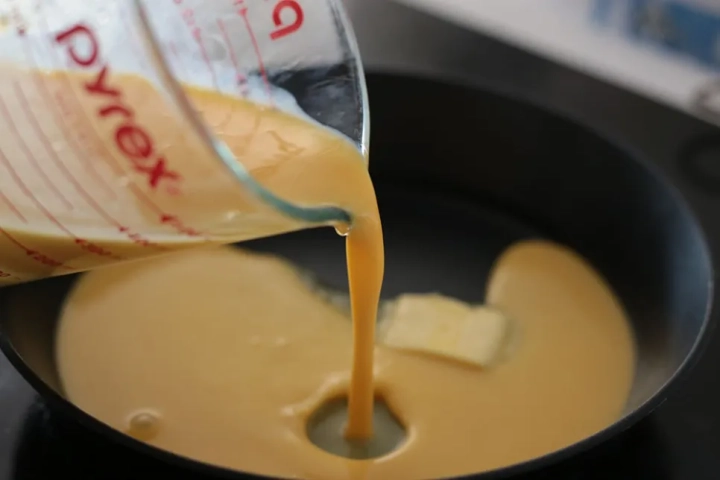 버터가 녹기 시작하면 약불을 유지하고 달걀물을 부어주세요.