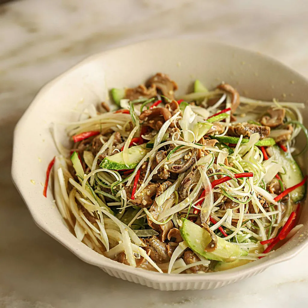 오이, 양파, 대파, 고추를 넣고 겨자소스와 섞어주세요.