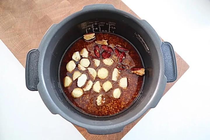 불린 찹쌀을 밥솥에 담고 소스를 부어 취사해주세요.
