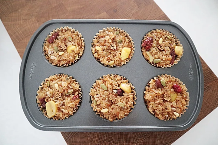 완성된 약밥을 꾹꾹 눌러 담아 굳혀주고