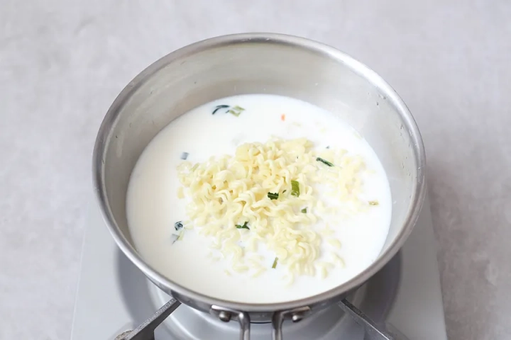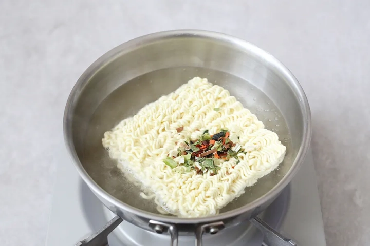 라면사리를 그대로 넣고 함께 끓여주세요.