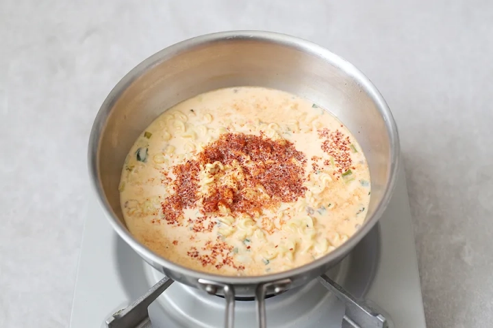 라면스프와 고춧가루를 넣고 같이 끓여주세요.