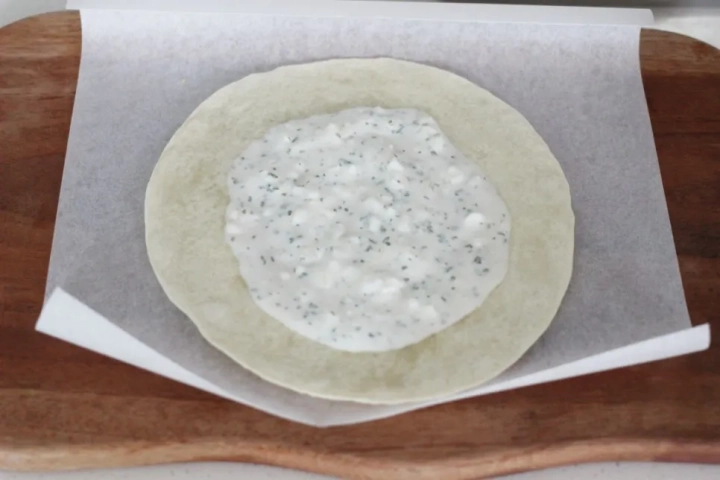 그 위에 또띠아를 올려주고 소스를 골고루 발라주세요.