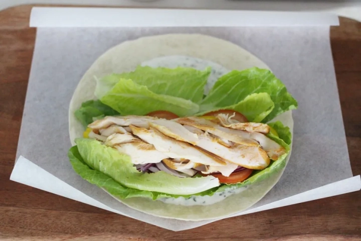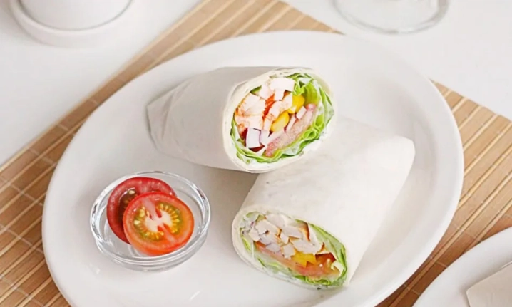 [재료]: 또띠아, 치킨, 토마토, 양파, 상추, 야채