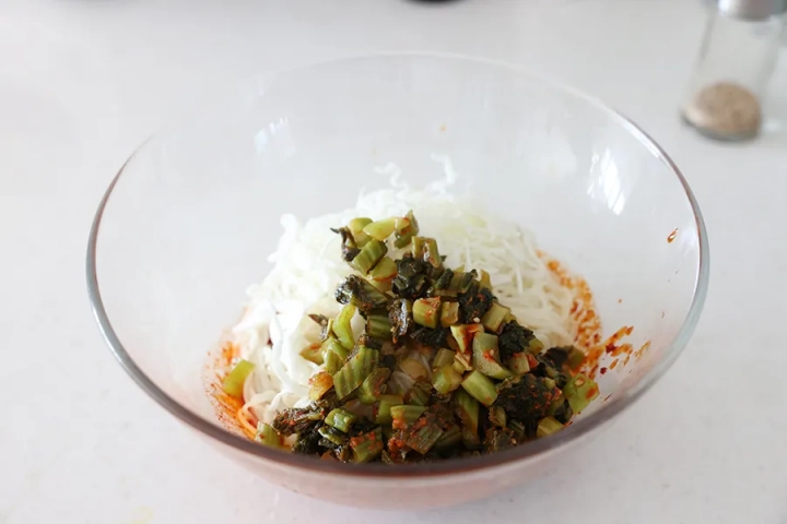 줄기가 굵직한 갓김치는 쫑쫑 썰어주세요.