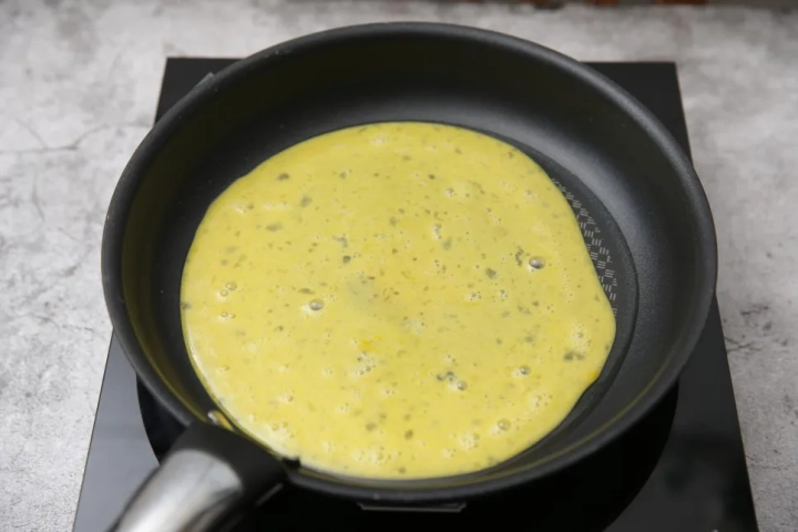 예열된 팬에 기름을 두르고 달걀물을 넣어주세요.