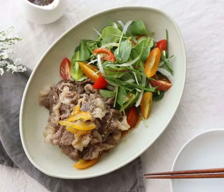 [재료]: 차돌박이 200g, 부추, 양파 1/4개, 새싹잎채소, 토마토