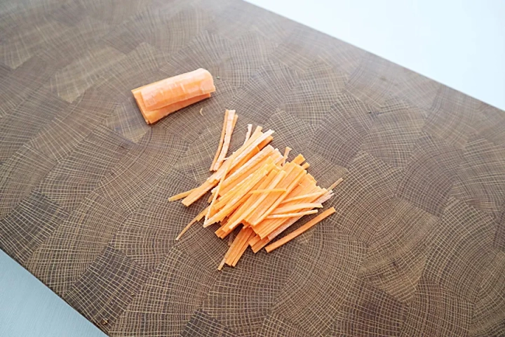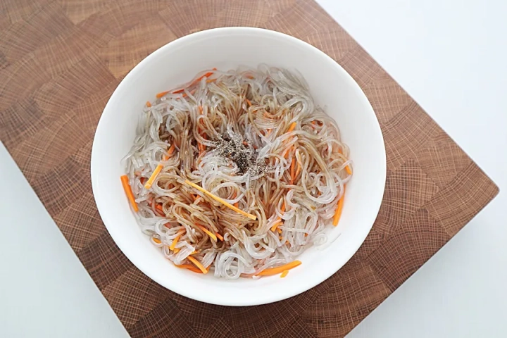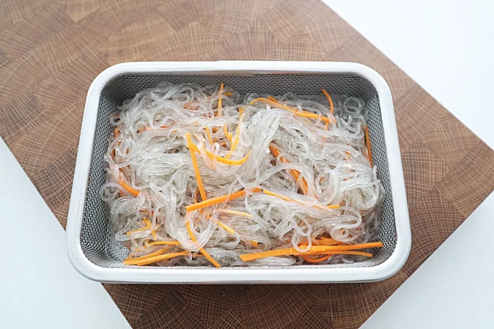 당면은 채에 걸러 물기를 제거하고 볶은 당근을 더해 섞어주세요.