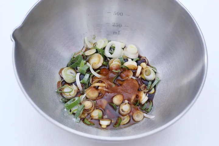 [양념재료]: 고춧가루 1큰술, 설탕 1큰술, 간장 1.5큰술, 참기름 1큰술