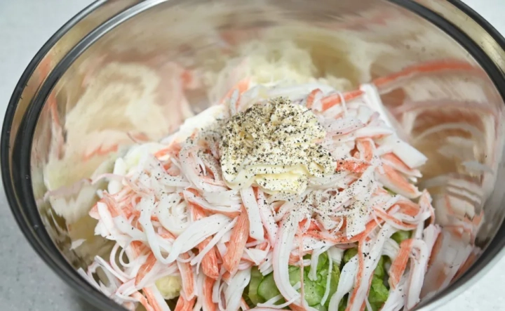 [양념재료]: 식초 1큰술, 설탕 1큰술, 마요네즈 4큰술, 후추 약간